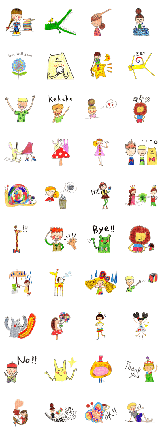 生き物や子どもたちをカラフルに、色鉛筆で描いたスタンプ。温かな世界にホッと癒されること間違いなしです。