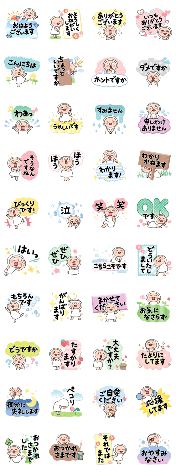 | スタンプ説明 | キモカワしろめちゃんシリーズからカラフルで純粋に可愛いスタンプ登場。大きい文字で目上の方・先輩・ママ友に使いやすい春からの新生活におすすめしたいスタンプです。 |