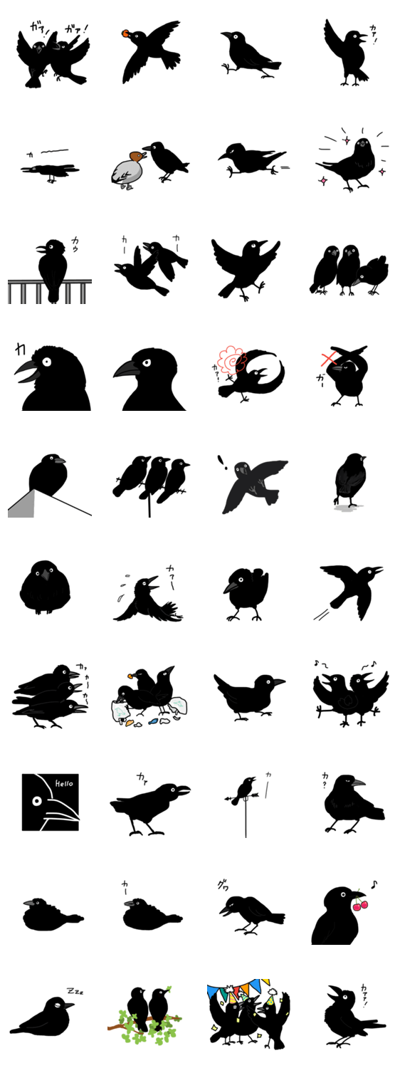 | スタンプ説明 | カラスのしぐさと鳴き声でコミュニケーションするスタンプ第3弾。さらにカラスでカァカァカァ! |
