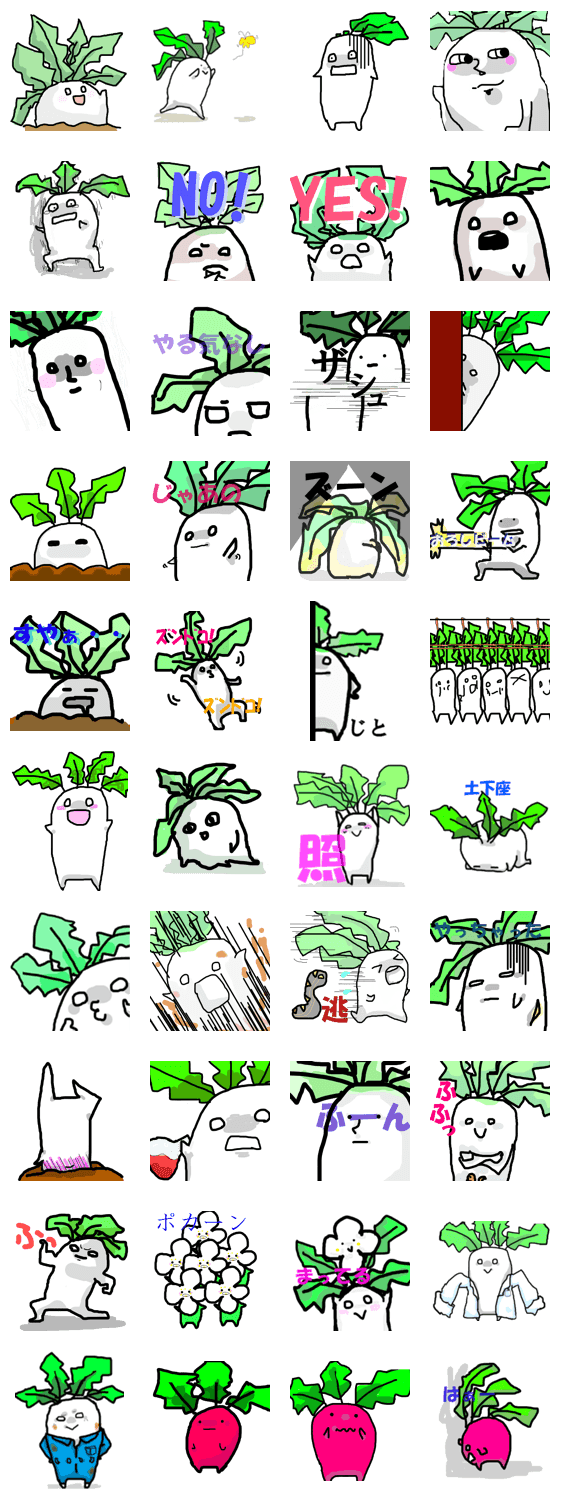 ダイコン、二十日大根をモチーフにシュールなスタンプを作ってみました。気がるに使えるものもあるのでよかったらどうぞ!