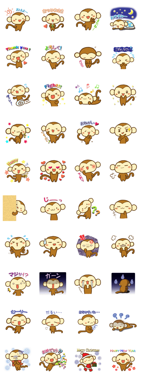 2016年干支のさる(申・猿)の可愛いスタンプです。日常会話に使いやすい言葉やポーズを中心にまとめました。クリスマス・お正月スタンプもあり、年末年始にもオススメ!