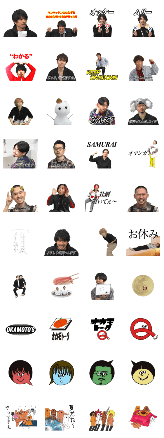 | スタンプ説明 | OKAMOTO'S公式アプリ「オカモトークQ」で配信中、 メンバー4人でダラダラ喋ってしまおうというスペシャル番組「オカモトーク!」の公式スタンプが登場! |