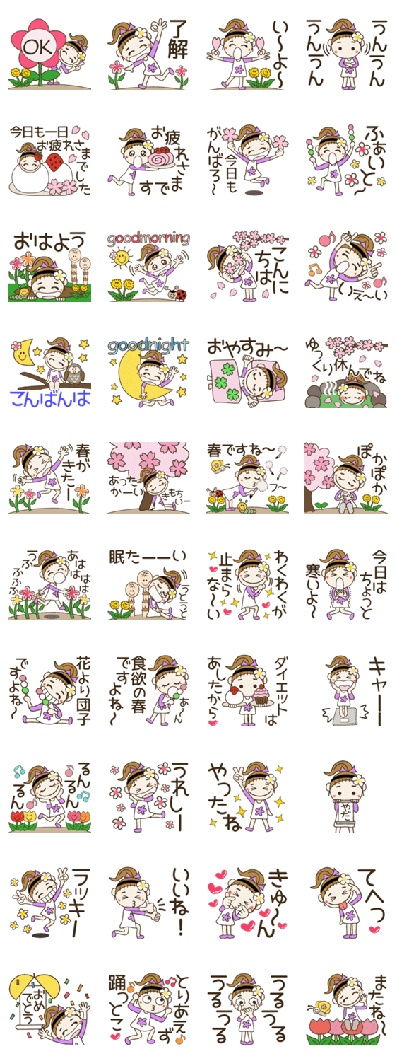 いつも元気なポニーテールの大人女子、おちゃめの春の日常会話編。毎日使える言葉、気持ち色々。文字の枠は白にしてありますので黒い背景でも大丈夫です。