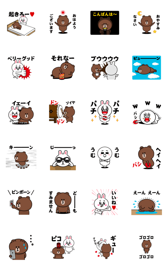 | スタンプ説明 | LINEキャラクターズのブラウン、コニー、ムーンが登場する、毎日使えるて便利な日常会話系の挨拶スタンプです。カップルで使ってもおもしろいです。 ※BROWN & FRIENDS をみんなでつくろう!キャンペーン参加スタンプです |
