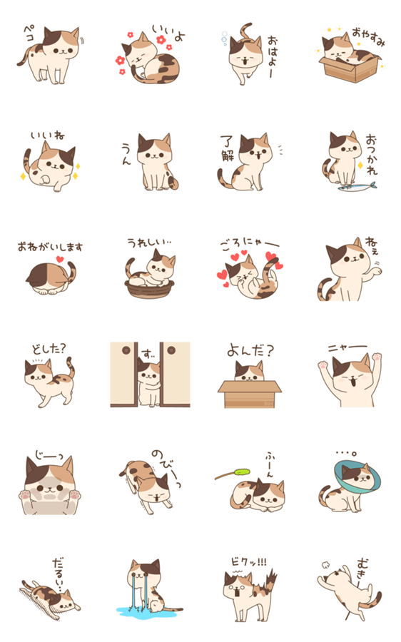 かわいくてちょっぴり気まぐれな三毛猫の、便利な言葉がたくさん入った使えるスタンプ♪