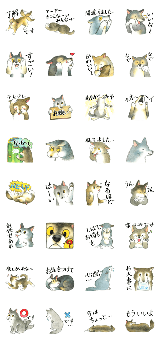 水彩で描いたオオカミ犬たちのスタンプ第2弾です。
