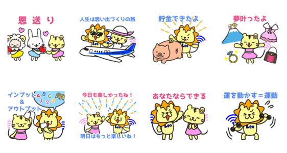 | スタンプ説明 | Leo onlineから誕生したLineスタンプ第四弾が登場! ライオンのソルくんとトラのルナちゃんです。 ラテン語で太陽と月!ソルくんたちと一緒にお金について学びましょう^^ |