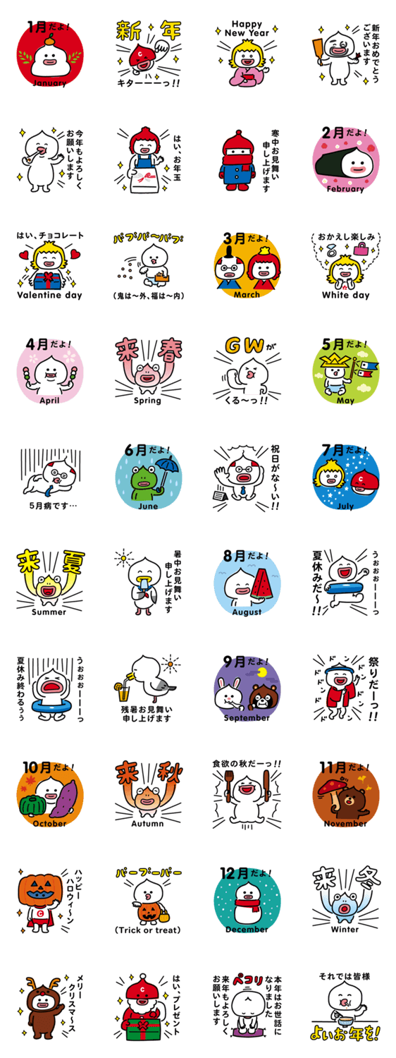 ちぇけスタ第25弾。春夏秋冬、1月から12月までのお知らせと挨拶のスタンプです。
