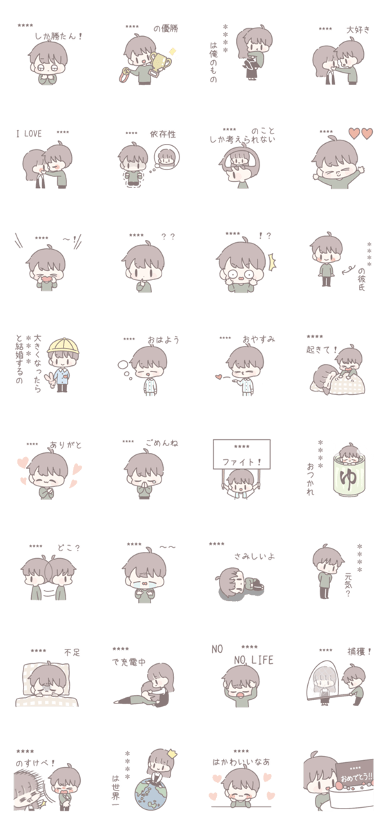 カップルや夫婦向けの、彼女を愛でて褒めるスタンプです。関連用語:同棲/彼氏/男の子/推し/溺愛/夫/彼女/応援/かわいい/恋人/好き/カスタムスタンプ/名前