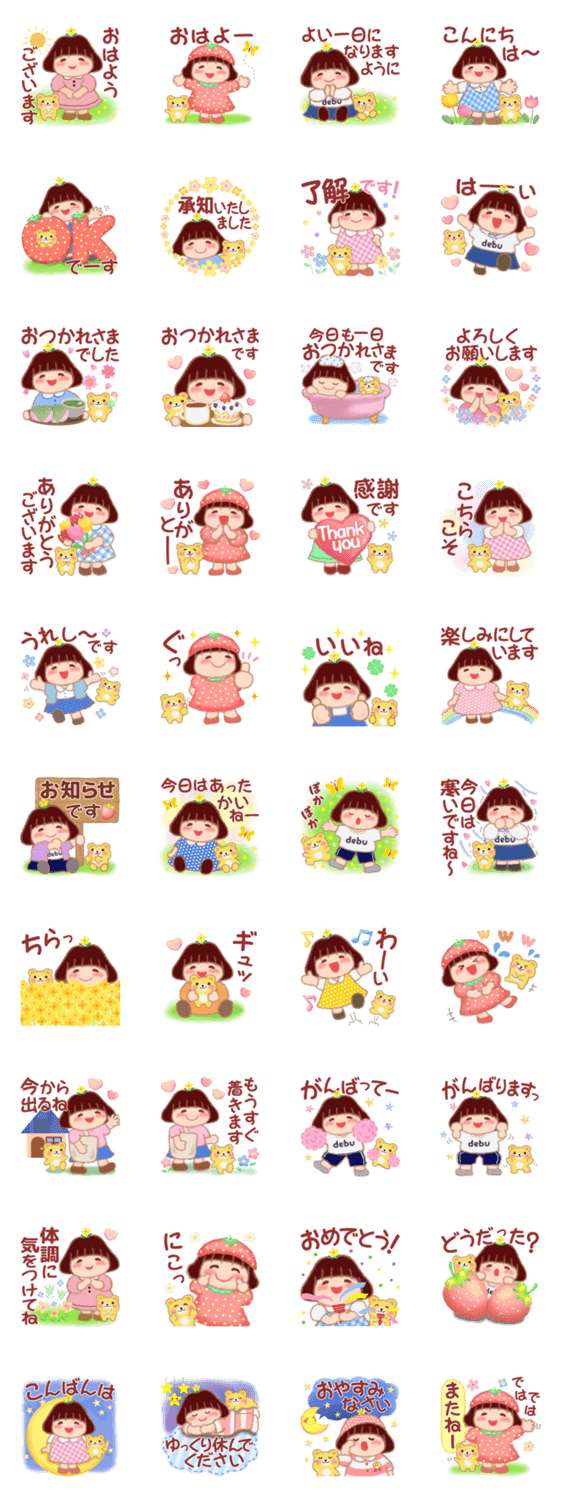 日常の挨拶、優しい気づかいに… 友達や家族、大切な方へ…ちょっと太めの女の子「でぶりん」がおくる春に使えるスタンプです。