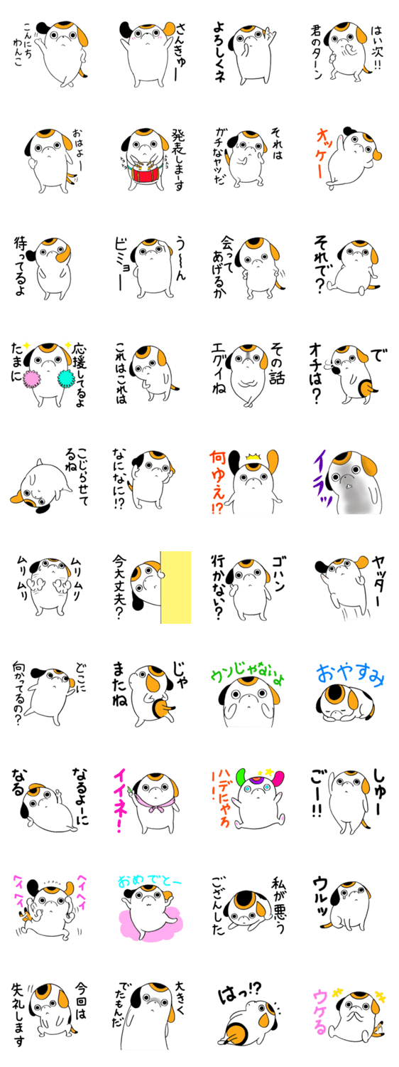 三毛猫のようでそうでない、実は犬の”三毛わんこ”の のほほんとしたスタンプです