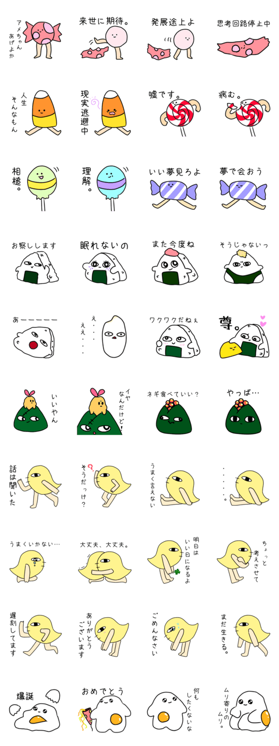 キャンディ、おにぎり、ヒヨコ、タマゴのごちゃまぜスタンプ。思いつくがままに作りました。意外と使えるかもしれません。