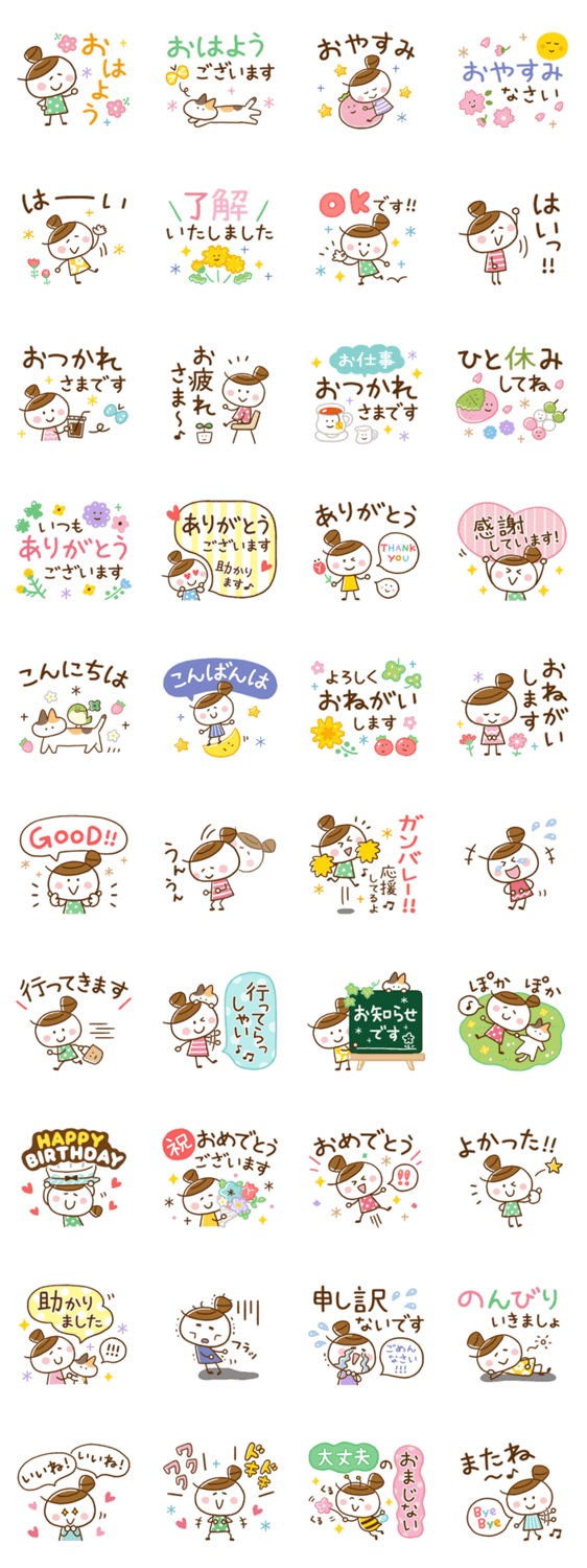 おだんご女子の大人かわいいスタンプです。 日常的に使える挨拶言葉が盛りだくさんです! 春めいたふんわり優しいスタンプになりました♪