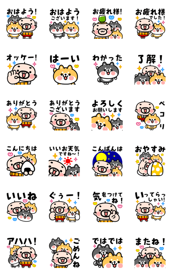 おやじ君と2匹の柴犬のかわいい飛び出すスタンプ。よく使うあいさつがそろってるよー!