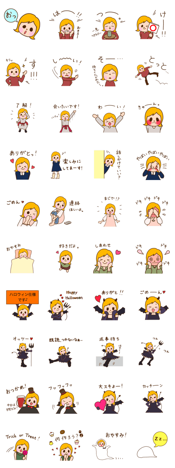 小悪魔ガール第2弾。全国の乙女が素敵な恋愛ができますように★後半はハロウィンコスで仕上げているので、この秋、飽きが来ず毎日しっかり使えるスタンプです♪