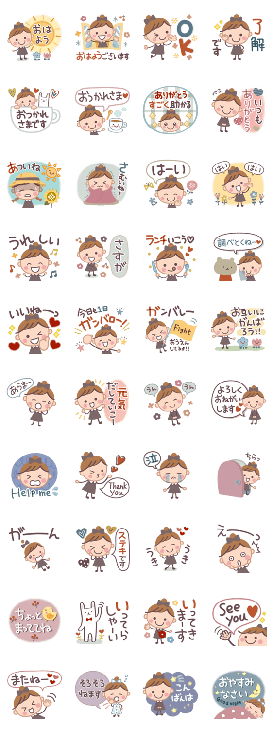 毎日使える可愛い女の子のスタンプ。くすみカラー/北欧/ガーリー/ほのぼの/キュート/デカ文字/お団子