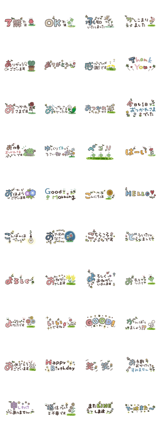 気弱な人や控え目な人でも使いやすい横長省スペースのスタンプです♪ お花や植物がかわいいシンプルなスタンプで、目上の方や先輩にも使いやすくなっています。