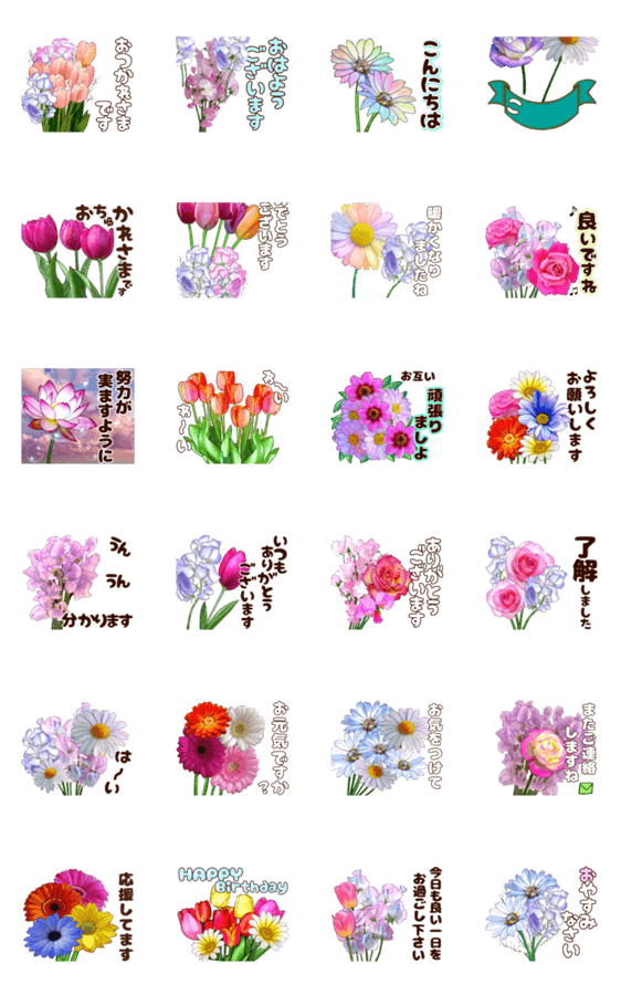 チューリップ、ガーベラ、スイートピー、バラなどカラフルなお花が可愛いく風に揺れてます。ずっと使える挨拶日常会話お返事敬語で大人女子が春夏秋冬使いやすいものばかり