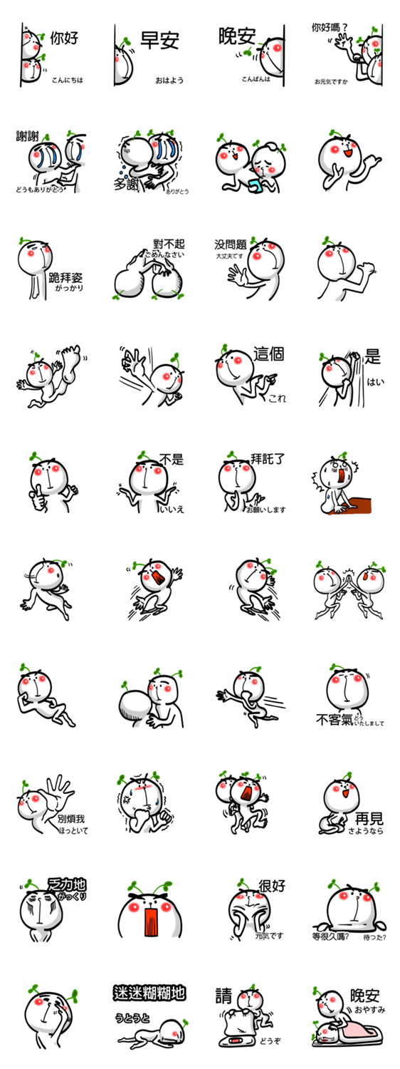 なぜか頭から芽が生えています・・・。台湾語と中国語、日本語で使えるスタンプです。