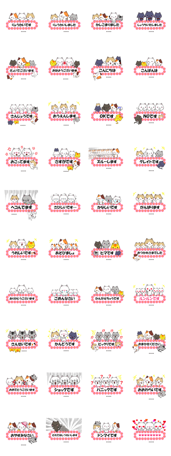 ネコだらけの花枠吹き出し敬語のカスタムスタンプです。名前を付けたり自由に好きな言葉を一言付け加えられます。短い名前はスペースを入れれば右端に寄せれると思います。