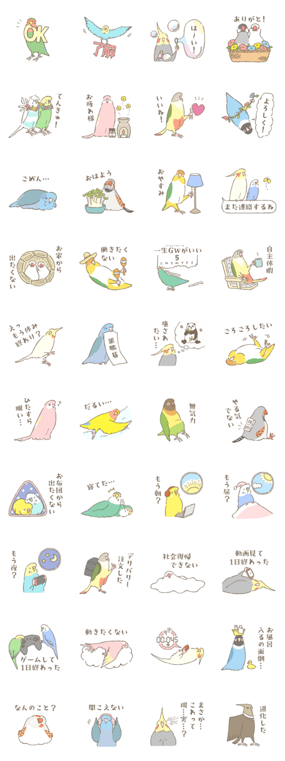 とりちゃんたちの無気力なスタンプです。 コザクラインコ/セキセイインコ/オカメインコ/ウロコインコ/シロハラインコ/アキクサインコ/マメルリハ/文鳥/キンカチョウ/インコ
