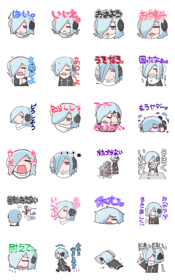 片目が隠れていて羊の角っぽいものが生えている男の子。 おはようから憂鬱なときまでつかえます。