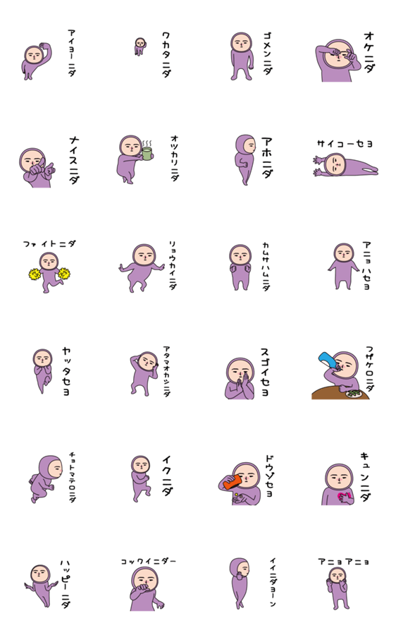 いつもの面白スタンプ(薄紫タイツ編)韓国、アニョハセヨ、カムサハムニダ、楽しんで下されニダ