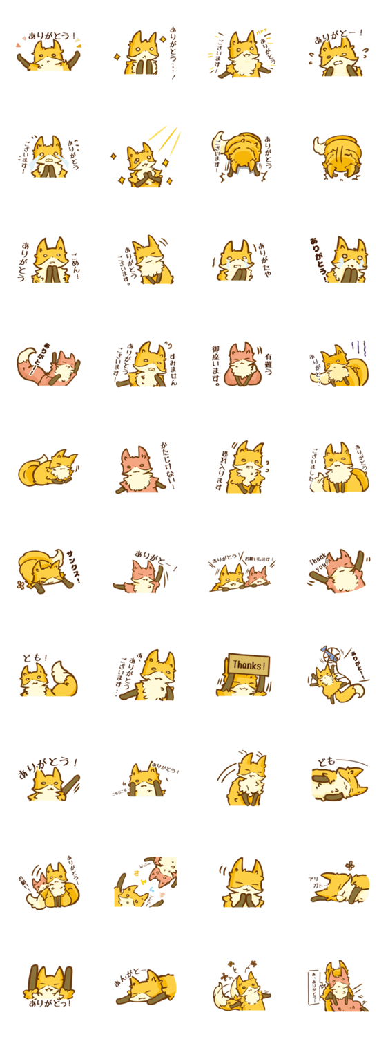 のんびりしたキツネのゆるいメッセージスタンプです。今回は、「ありがとう」の詰め合わせセットです。上司・部下・友達・家族などとの会話で感謝を伝える際にどうぞ。