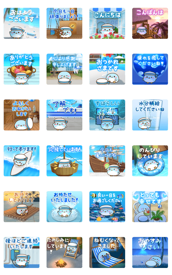 礼儀正しいペンちゃんがポップアップスタンプになりました!セーラー帽子をかぶる船乗りのペンギンちゃん。丁寧語で話すのが癖なようです。常夏の南の島からお届けします!