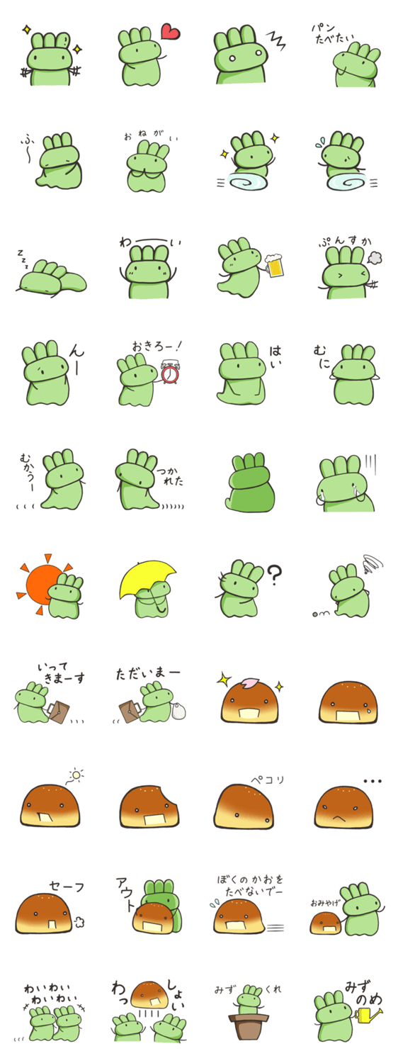 あんパンが大好物の不思議植物「やくそうぞく」と、やくそうぞくにかじられたくない「あんパン」のスタンプです。