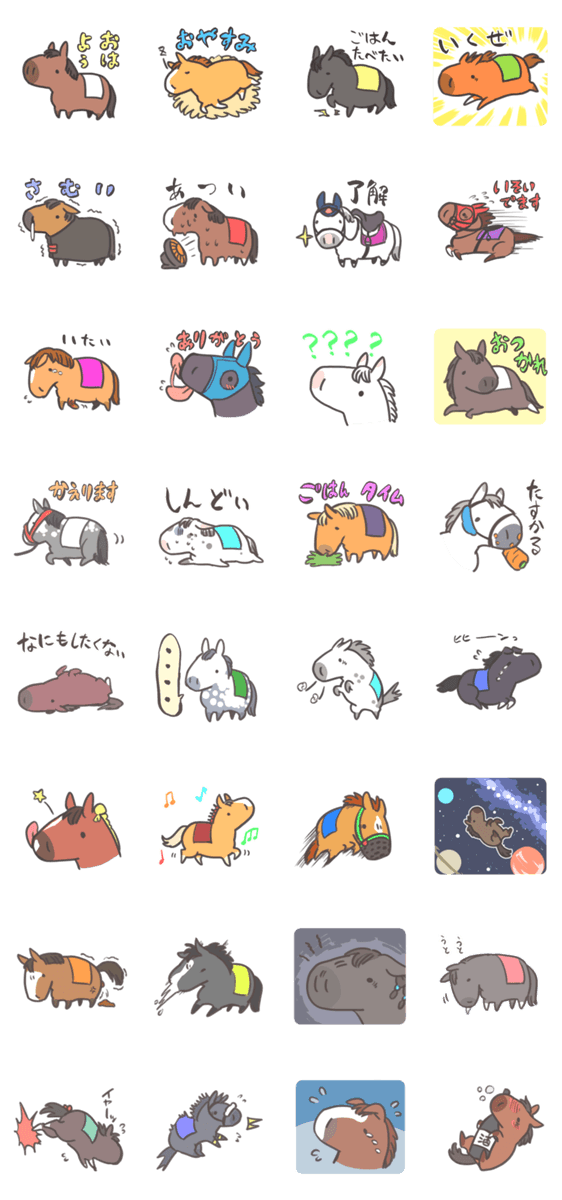 UMAのスタンプです。もちもちデフォルメされた馬たちです、サラブレッドの毛色オンリーです。