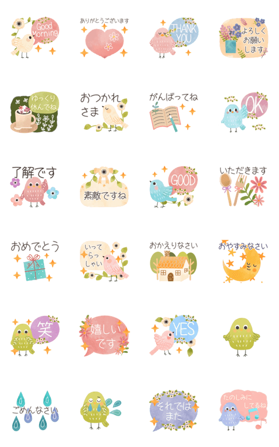 優しいカラーの小鳥達が、可愛く動くスタンプです。お花やマカロンスイーツ、吹き出しなどを詰め込みました。毎日のあいさつにも使える日常スタンプです。