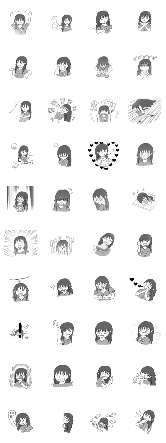 | スタンプ説明 | ちょっとオタクなインドア少女がモデル。日常でよくある反応や感情表現をマンガ的に表現したスタンプです。 |