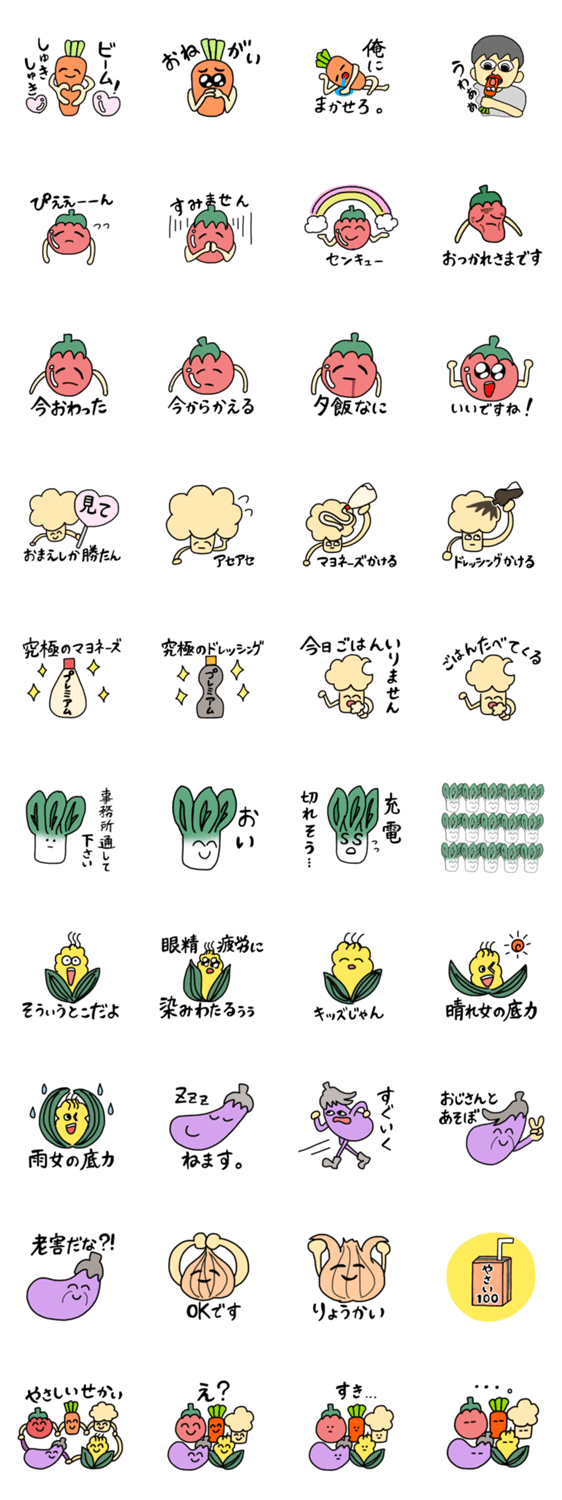 | スタンプ説明 | オリジナルより大きめのサイズ感だからやさいたちの顔がよく見える! |