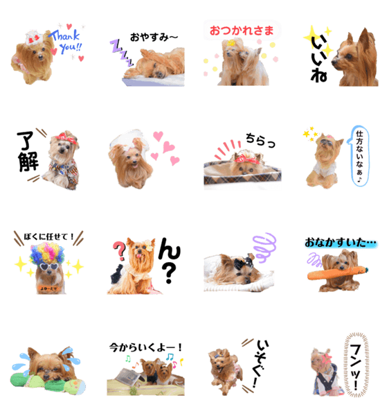 犬のヨークシャテリア4匹の写真で作ったシンプルでか文字なスタンプです。日常会話を可愛く、面白くサポートしてくれます。