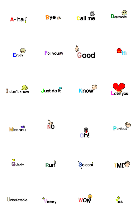 スタンプ説明 アルファベット順に日常的な感情を表現しました。