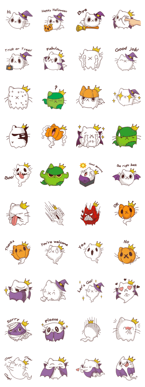 | スタンプ説明 | Fab Cat loves dressing up as a vampire, ghost, ghoul, mummy or a witch! This kitty wants to share this fabulous Halloween fun with you through chat! |