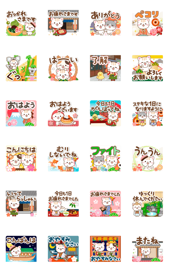 | スタンプ説明 | 和風スタンプ第3弾です♪お茶屋さんや下町の風情をイメージしたものに、和柄のポップなものを合わせてみました。気遣いや楽しさが混ざっていて楽しめる挨拶スタンプです。 |