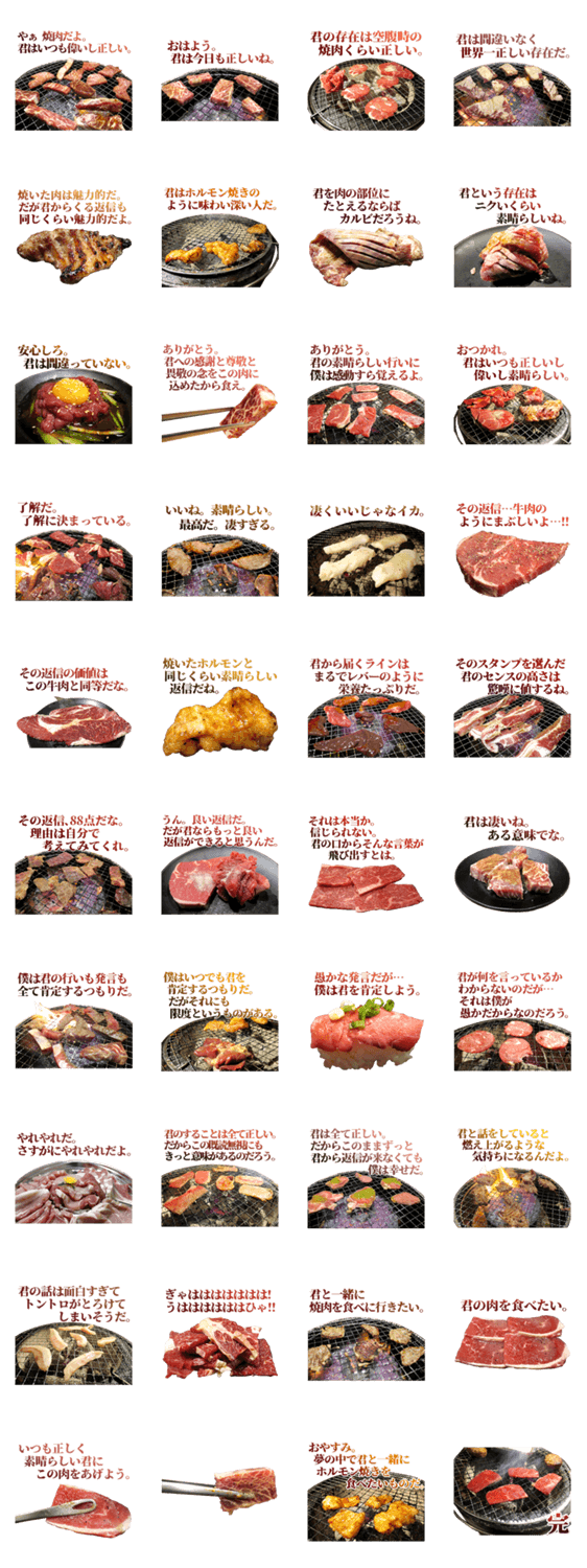 焼き肉がすべてを肯定するスタンプです。とりあえず肯定しておけば万事丸く収まります。みんな幸せ。生肉、やきにく、ヤキニク、牛肉、ホルモン。実写面白い食べ物スタンプ