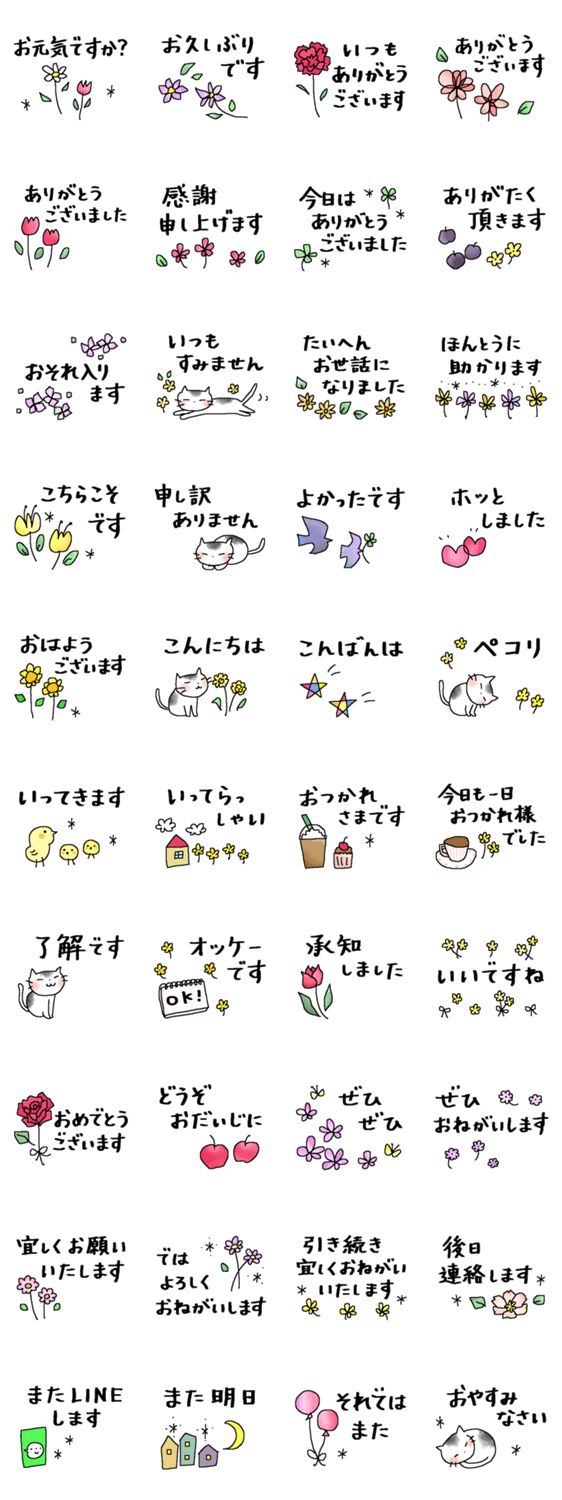 とてもシンプル*見やすい文字でサクツと送りやすい40個。日常よく使う言葉を敬語と花を多めに作りました。大人のためのあっさり、すっきり控えめな実用的なスタンプです。