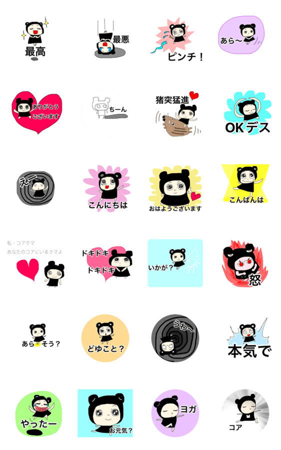 | スタンプ説明 | ヨギーのコアにいるクマです。本人もヨガします。煩悩の塊 |