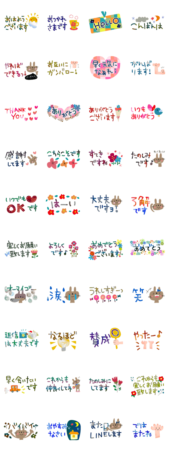 省スペースで文字大きめメッセージが読み易く、ポップでカラフルな大人スタンプ。鳥やウサギお花など北欧テイストも織り交ぜました。気遣い込めた毎日使えるスタンプです。