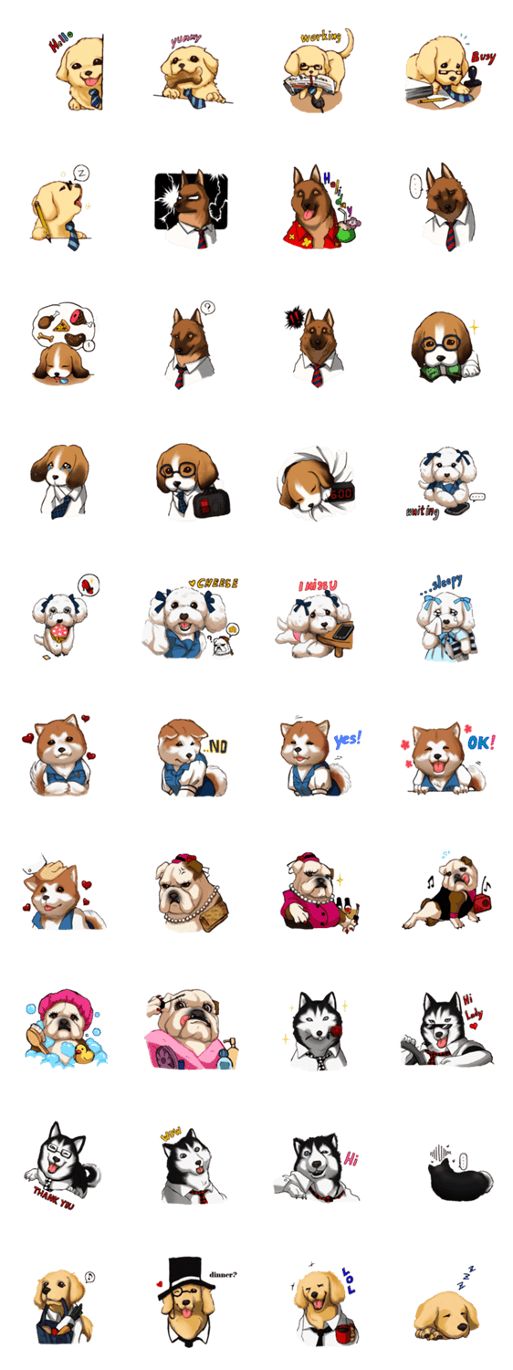 | スタンプ説明 | Labrador Retriever:Cody German Shepherd :Jake Beagle :Milo Golden Retriever :Oliver Bulldog :Lola The BossPoodle :Abby Akita :Haru Siberian Husky :Joey |