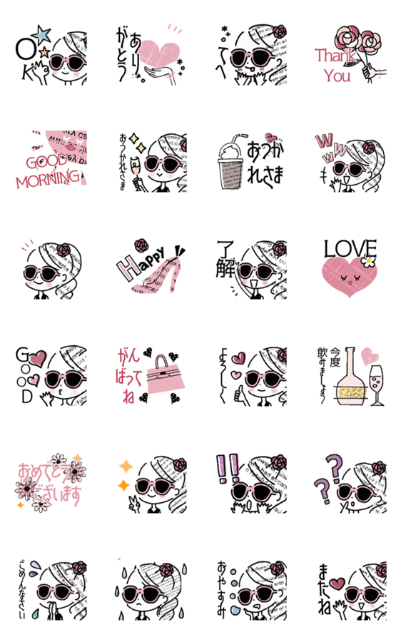 サングラスの女の子の動く毎日スタンプです。女子らしい可愛いアイテム、挨拶を詰め込みました。 ハート/花/指輪/可愛い