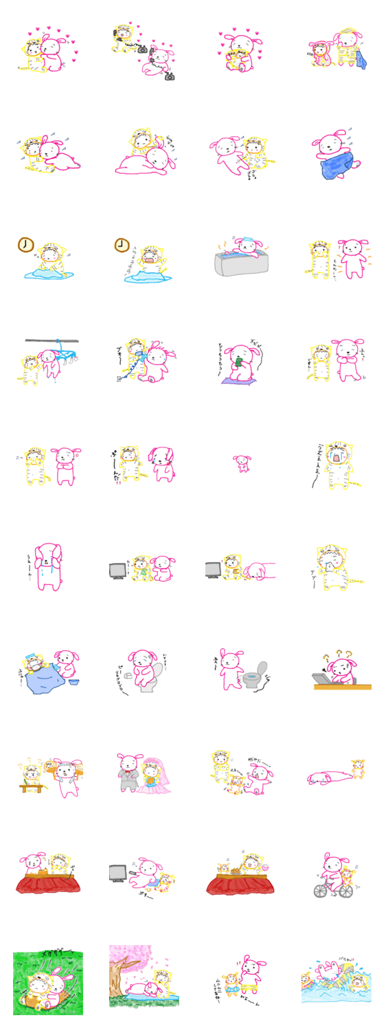 彼氏と彼女ってこんなことあるよねーっ。少しツンデレ?トラの着ぐるみを着たみぃとらと、彼女のことがとっても大好き!ウサギの着ぐるみを着たかゎぅさのほのぼのスタンプ