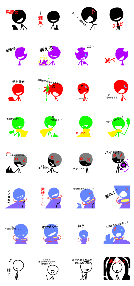 LINEスタンプメーカーでつくったスタンプです。オリジナルキャラの棒人間シリーズの悪役versionでございます。これ使える人はいろんな意味で凄いですよ。