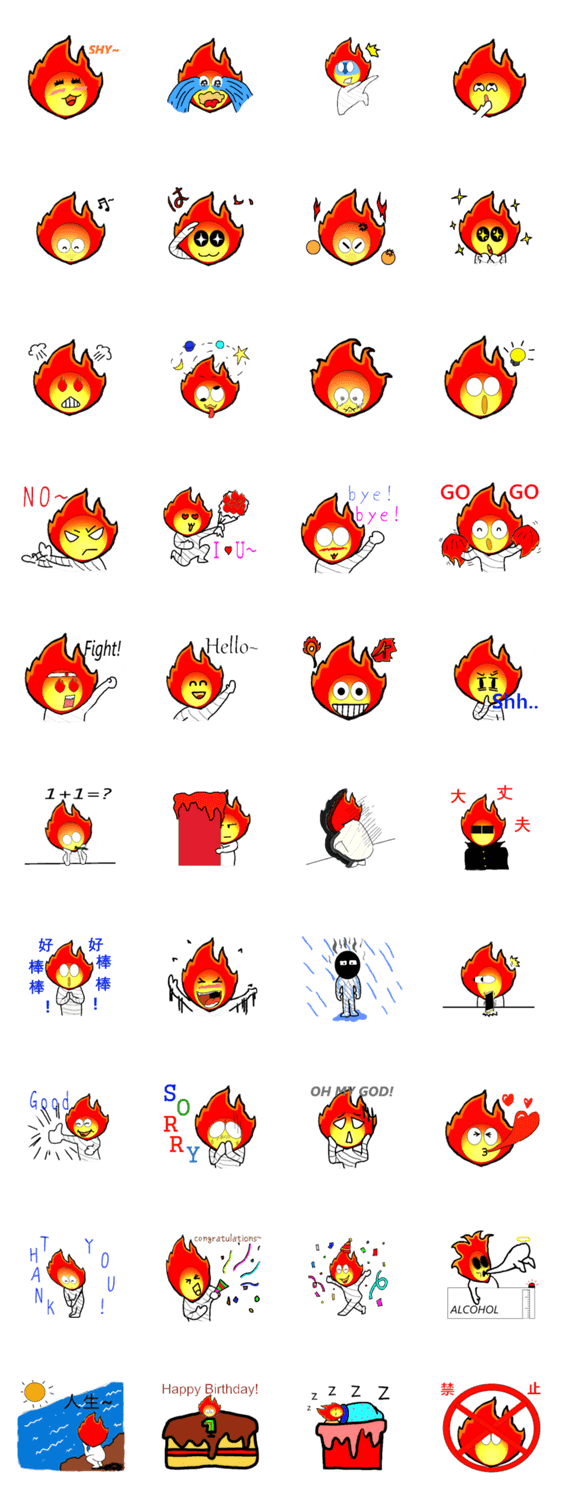 | スタンプ説明 | Fire core man: parahello, I am Fire core man. I am very cute but..... Be careful with fire ~please |