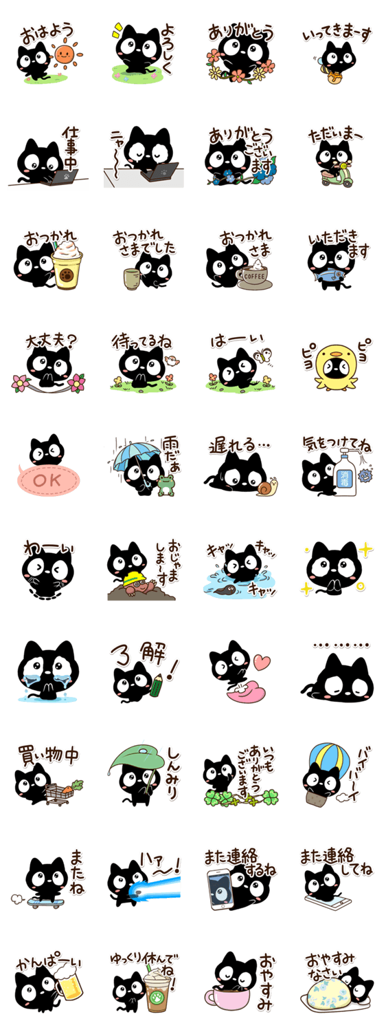 『クロネコすたんぷ』の【絵文字】と【着せかえ】もあります。便利で使いやすい言葉を集めた、ちいさい黒猫スタンプ。かわいい、くろねこ好きな方にぜひ。【かたこ】