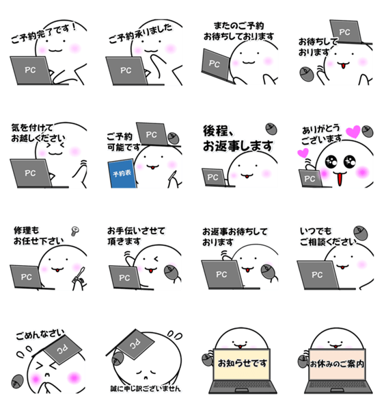 生徒様とLINEでご予約等のやり取りをする時に使うスタンプです。 予約のやり取り、お休みや連休のご案内、各種お知らせなどに対応することができます。