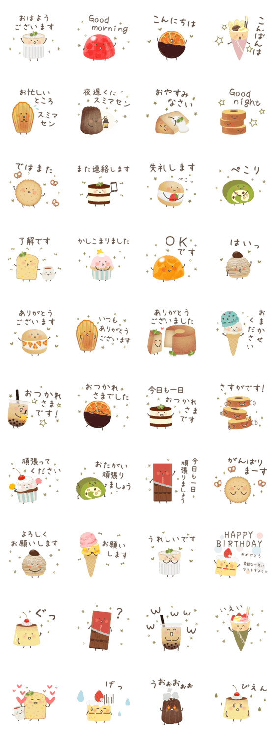 ゆるいスイーツたちの日常で使えるスタンプです。つぶらな瞳であなたに微笑みかけます♪